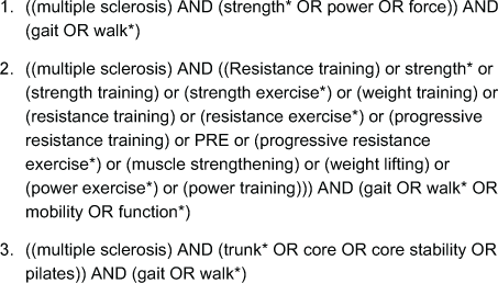 Electronic searches of the PubMed, PEDro (Physiotherapy Evidence Database), and Embase databases were conducted using combinations of the following search terms: multiple sclerosis, strength, power, force, resistance training, strength training, progressive resistance training, weight training, gait, walking, mobility, and function. In addition, the following Medical Subject Heading terms were searched on PubMed: multiple sclerosis, gait, resistance training, and weight training. The full search strategy conducted on the PubMed database is presented in Figure 1. In addition to primary searches, reference lists of relevant articles, including systematic reviews, were examined for additional relevant articles. Two authors (M.M.M. and S.G.) conducted searches and screened articles. Any disagreements on article selection were settled by a third author (M.S.), and where methods or reporting were not clear, attempts were made to contact primary authors. Risk of study bias was assessed (by M.M.M. and S.G.) using the PEDro scale and was validated using the PEDro database. Studies were not excluded based on PEDro scale score.