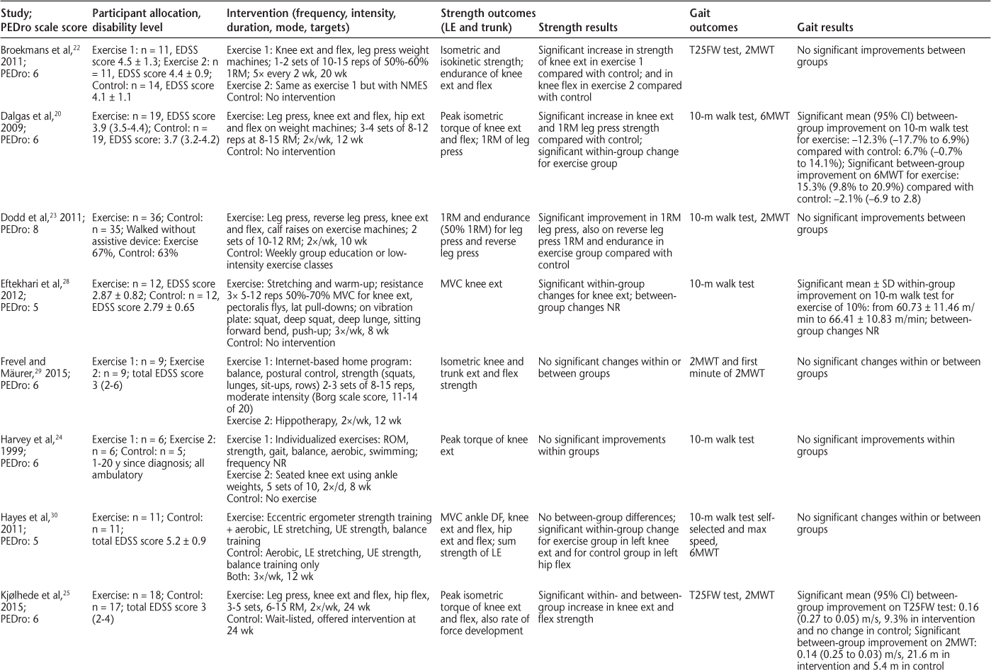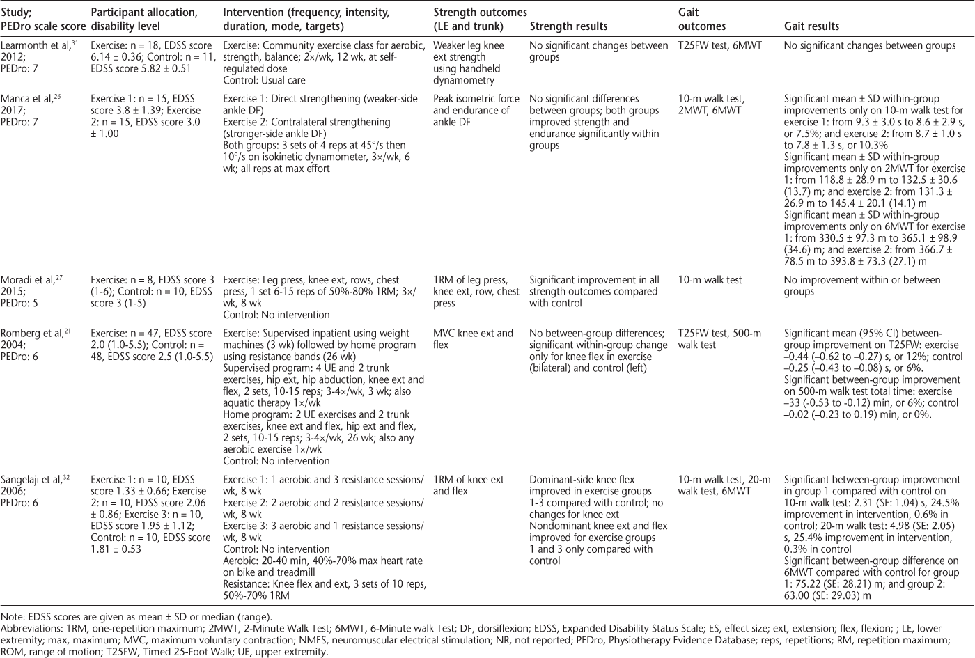 Information about sample size, power calculation, disability level of participants, length of follow-up, and other interventions was extracted from each study. In addition, data were extracted for 1) strength and gait outcomes used in each study; 2) reported results for strength and gait outcomes; 3) exercise parameters (strength training intensity, frequency, and duration); and 4) intervention approach (mode, position, and muscle targets) of each exercise. Each article was reviewed by two of us (M.M.M. and S.G.) independently. Data were extracted for postintervention measures only, because not all studies included a follow-up assessment. Data were extracted for between-group comparisons when available, but if not reported, data for within-group comparisons were extracted. Extracted data from the included studies are synthesized in the tables and summarized in the text. Data on exercise parameters were compared with frequency and intensity guidelines for strength training in people with MS of two to three times per week, one to four sets of 10 to 15 repetitions at 10 to 15 repetitions maximum.11 17 Results for changes in gait were also discussed in the context of meaningful or clinically important change. Based on the broad eligibility criteria, it was expected that there would be considerable heterogeneity between studies in terms of interventions (eg, including other interventions besides strength training) and outcomes (eg, strength or gait not the primary outcome), thus no meta-analysis was planned.
