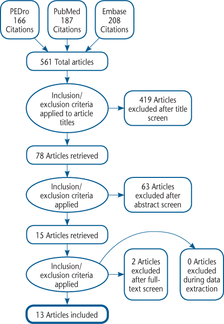 Five hundred sixty-one articles were identified via electronic search of the three databases through July 2017 (Figure 2). After applying the eligibility criteria and removing duplicates, a total of 13 articles20–32 met the eligibility criteria (Table 1). No additional studies were identified after reviewing reference lists from the included articles or other relevant systematic reviews. Two authors provided clarity on protocols.20 21 Seven studies had at least one arm that included only strengthening,20 22–27 and six studies included strengthening with other interventions,21 28–32 most commonly aerobic exercise, stretching, and balance21 29–32 but also combined with a vibration plate.28 Nine studies were performed primarily in a supervised outpatient setting20 22 23 25–28 30 32; three included primarily home exercise programs,21 24 29 and one involved a community exercise class.31 Disability level varied across the studies, but most participants were ambulatory for at least 100 m with or without an assistive device (Expanded Disability Status Scale [EDSS] score <6.0) except in the study by Learmonth et al,31 in which the mean ± SD EDSS score in the intervention group was 6.14 ± 0.36. Dodd et al23 and Harvey et al24 did not report disability using the EDSS, but all of their participants were reported to be ambulatory. Sample sizes ranged from 17 to 95 participants; two studies were powered to detect changes in gait,21 23 and three for strength changes.20 25 26 The median PEDro score was 6 (range, 5–8). Full risk-of-bias assessment is presented in Table 2.