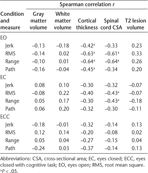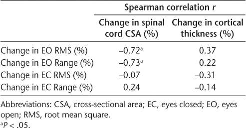 At baseline, sway measures were inversely related to cortical thickness and cord cross-sectional area (CSA) during the EO task but only to cord CSA with EC (P < .05). After 2 years, the percentage change in sway amplitude and dispersion during EO tasks significantly related to the percentage decline in cord CSA (P < .01).