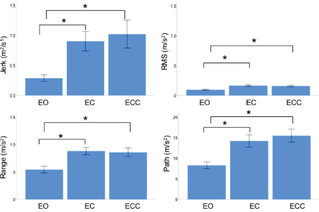 People with secondary progressive multiple sclerosis showed significant increases in root mean square (RMS), Range, Jerk, and Path with eyes closed (EC) and during dual-task performance with eyes closed and a cognitive task (ECC) compared with quiet standing with eyes open (EO)