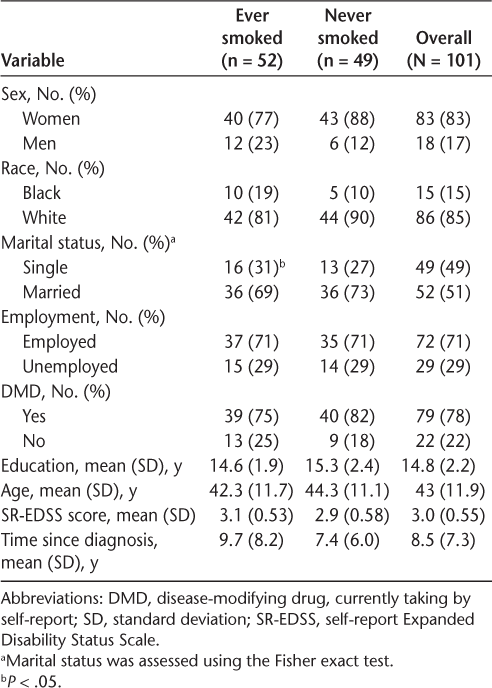 A total of 101 patients with RRMS took part in the study. Table 1 displays the sample demographics of the ever smokers and never smokers. The average age was 43 years. Most of the overall sample was female (83%), white race (85%), and married (51%). The overall mean duration of MS disease was 8.5 years and mean SR-EDSS score was 3 (Table 1). The overall prevalence of smoking (past or present) in the present sample was 52%, which is higher than the 45.5% obtained in patients with MS responding to the 2002 and 2008 iterations of the Integrated Health Interview Survey, a nationally representative general population sample of more than 74,000 people.6 Ever smokers in the present sample were more likely to be single compared with never smokers (P = .03). All other demographic characteristics and disability status (eg, SR-EDSS score, age, sex, race, and educational level) were not associated with lifetime smoking status.