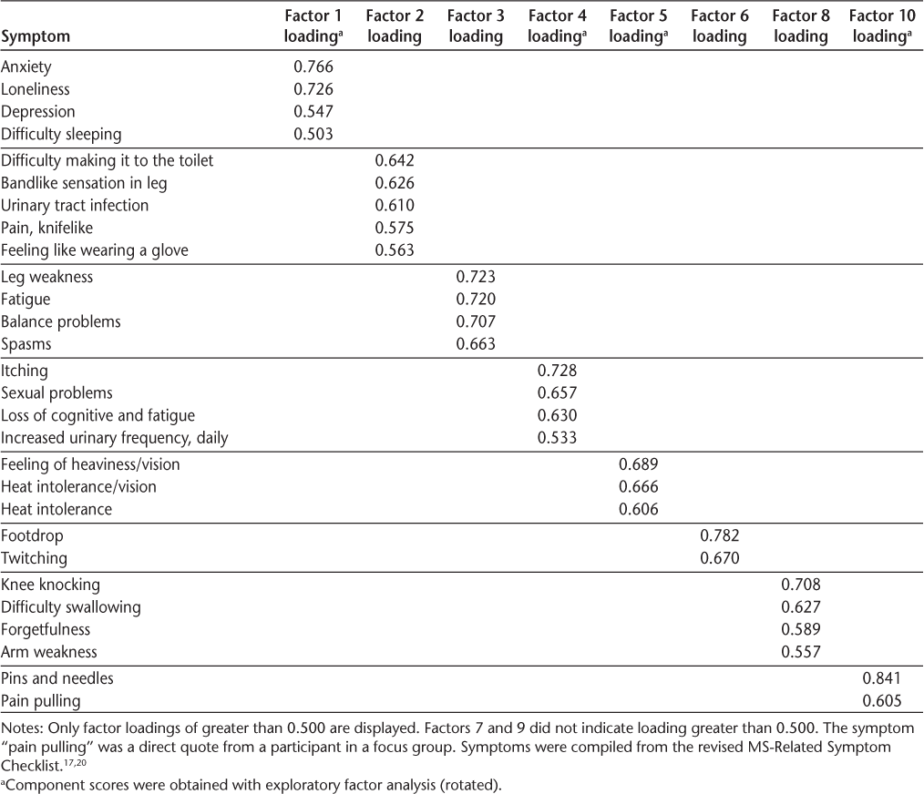 We used exploratory factor analysis to reduce the 43 MS symptoms to a lower number of variables and to identify empirically related groups of symptoms. Factors are based on empirically derived groupings (ie, co-occurrence) of items (symptoms in this case) that are believed to represent a more general underlying construct. The number of factors chosen (n = 10) for the factor analysis was based on the eigenvalues and the interpretability of the components.21 22 Each symptom's factor score coefficient that was produced by the factor analysis for each factor represented the strength of the relationship between the symptom and the latent factor and, thus, was treated as the relative weight of that symptom on the factor (eg, sensation). The factor scores (eg, sensation score) are a weighted sum of the loaded symptoms for each participant. Factors were then labeled based on the symptoms with the highest coefficients or factor loadings (>0.500) (eg, sensation).