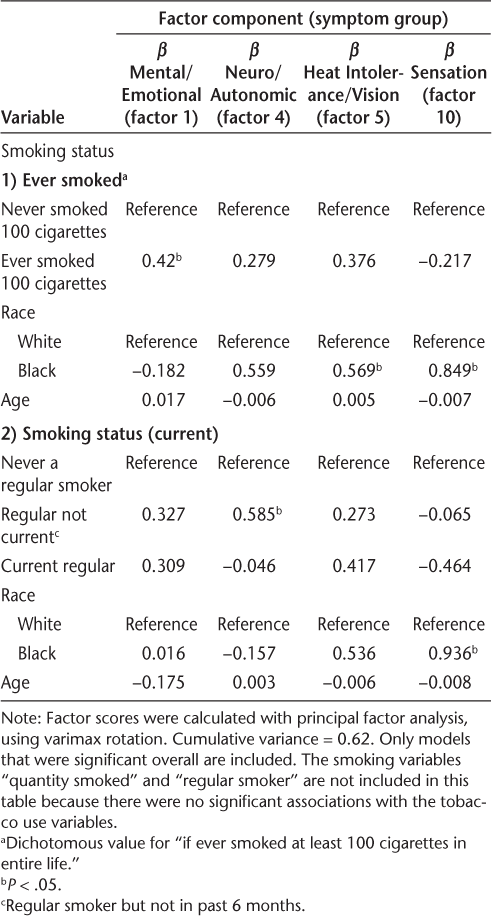 Being African American was associated with higher scores on the Heat Intolerance and Sensation symptoms (factors 5 and 10). No associations were found between race and the other symptom factor scores and either the quantity of cigarettes smoked or the four-category regular smoking variable.
