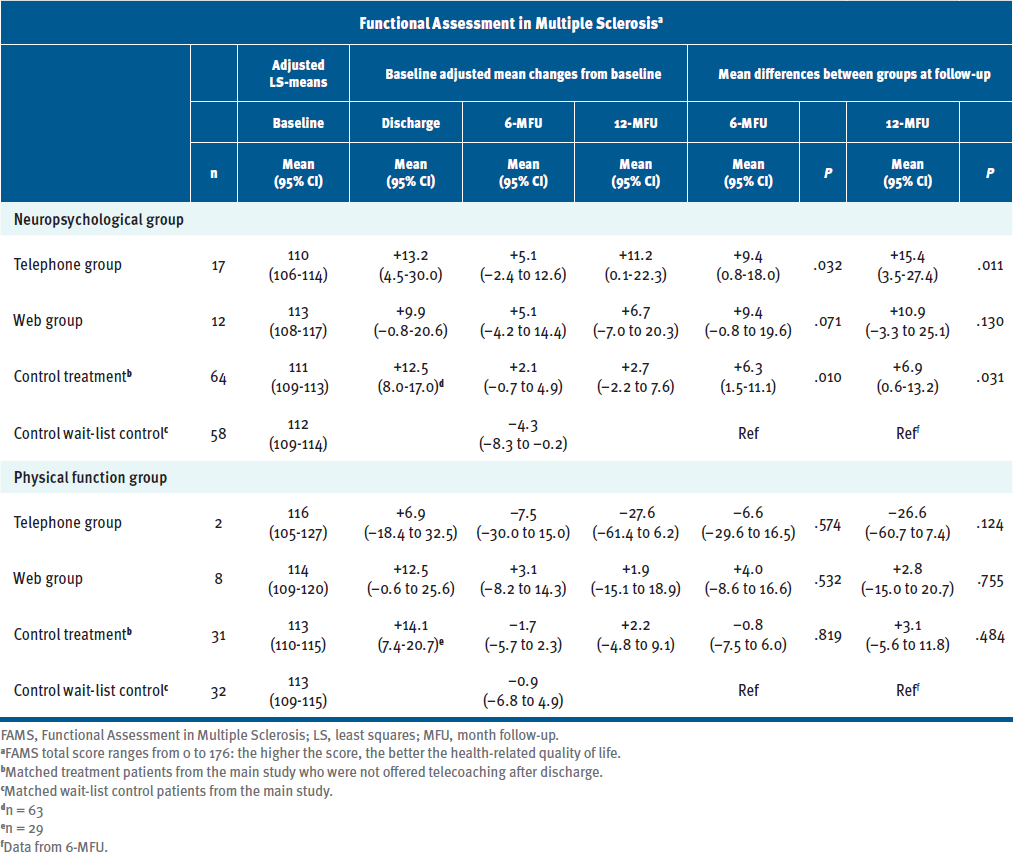We conducted a 1-year exploratory study with 2 delivery methods: telephone coaching and web-based coaching. After discharge, the telephone group received monthly calls; the web-based group responded to monthly online coaching questions. Based on their rehabilitation goals, we put patients into a neuropsychological group or a physical group. In addition, we matched each patient with similar wait-list control patients and treatment patients from the main study. The primary outcome was HRQOL measured by the Functional Assessment in Multiple Sclerosis (FAMS).