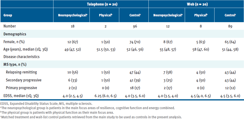 The total cohort was 40 participants. Of the 20 in the telephone group, 8 were assigned to the MFA of energy, 5 to cognitive function, 5 to resilience, and 2 to physical function. Of the 20 in the web-based group, 5 were assigned to energy, 2 to cognitive function, 5 to resilience, and 8 to physical function. Patients in the telephone group tended to be younger than patients in the web-based group (median of 49 years vs 56 years). Otherwise, the groups looked much the same at study start. The baseline demographics of patients with neuropsychological MFAs (resilience, cognitive function, and energy) and patients with physical function as their MFA are given in TABLE 1, along with disease characteristics. The median length of stay was 20 days (range, 14-20 days). No patients dropped out of the study, and all participants completed the 1-year follow-up. All were stable during the study period, with no overall progression in EDSS and no major changes in use of immunotherapy.