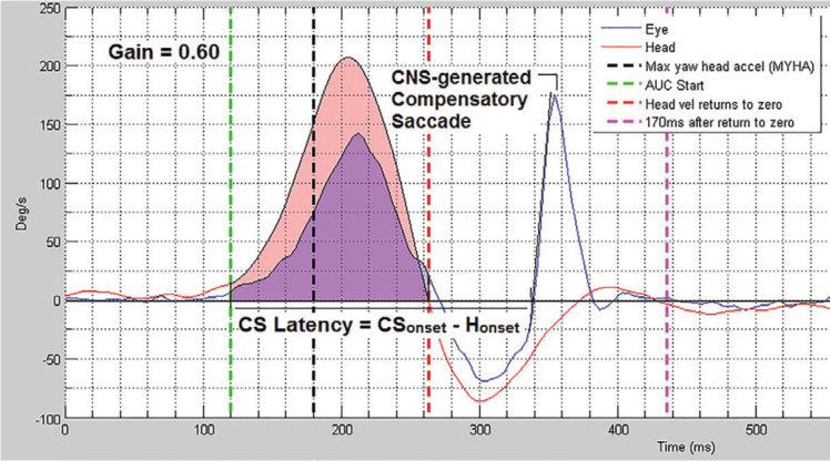 Gaze stabilization was determined using vHIT goggles (GN Otometrics) (Figure S2), which have been previously validated in people with aVOR deficits11,12 and have been used to demonstrate gaze deficits in persons with MS.8 The experimenter administered horizontal (yaw) head impulses to each side to collect at least eight trials suitable for analysis (Appendix S1). The study procedure has been described in detail by Garg et al.8 The gaze stabilization variables (Figure 1) were aVOR gain, number of compensatory saccades (CSs) per head rotation, CS latency, and gaze position error. The aVOR gain was determined by dividing the desaccaded eye velocity area under the curve (AUC) by the head velocity AUC, beginning with the onset of the head impulse to the instant when head velocity reverted to zero.9 The onset of head movement was preferentially determined by the methods described by MacDougall et al13 as the time point 60 milliseconds before maximal yaw head acceleration and confirmed manually by visual inspection. In a few instances in which the MacDougall et al13 technique inaccurately identified the onset, the start of head movement was identified as the latest point in time when the head velocity rose above zero and continued to move in the intended direction. Although head rotations to both (left and right) directions were performed, the aVOR gain of the worst-functioning side was used as the dependent variable. The CSs per head rotation were manually counted for each head rotation and then averaged over the number of rotations. For investigative purposes, a CS was defined as a horizontal eye rotation occurring during the head rotation that assisted a deficient aVOR and occurred in the direction of the vestibular slow component.25 The CS latency was calculated as the time between onset of head acceleration and onset of the first identifiable CS. The gaze position error was measured by subtracting the eye position from the target position when the head velocity returned to zero.