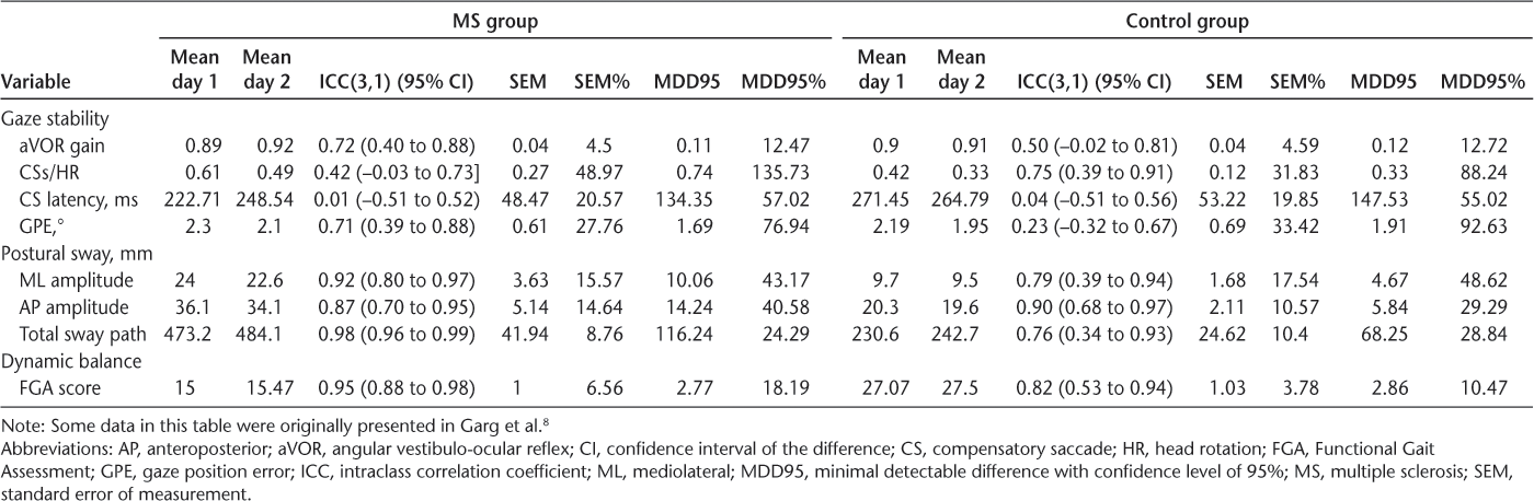 Nineteen adults with MS and 14 controls performed passive horizontal head impulses, quiet standing, and dynamic balance tests on two separate occasions. Gaze stabilization measures included aVOR gain, number of compensatory saccades (CSs) per head rotation, CS latency, and gaze position error. Postural sway included sway amplitude and total sway path. Dynamic balance measure included the Functional Gait Assessment. Intraclass correlation coefficient, standard error of measurement (SEM, SEM%), and minimal detectable difference at 95% confidence level were calculated.