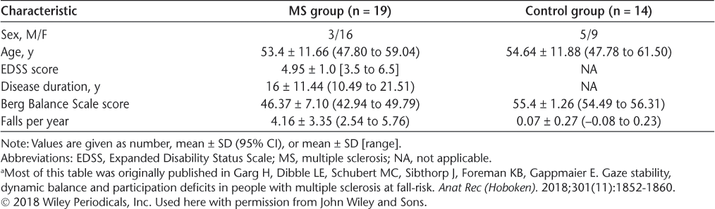 Nineteen persons with MS met the inclusion criteria and participated. The MS group comprised three men and 16 women with a mean ± SD age of 53.4 ± 11.7 years, falls per year of 4.2 ± 3.3, and disease duration (time since diagnosis) of 16.0 ± 11.4 years, and the control group included five men and nine women with a mean ± SD age of 54.6 ± 11.9 years and falls per year of 0.07 ± 0.27 (Table 1).