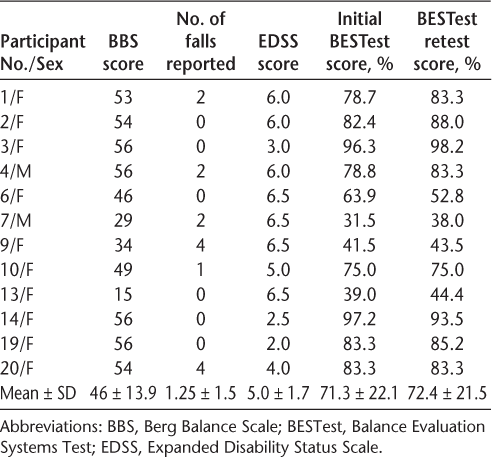 Twenty individuals with MS were recruited. Age, onset of disease, and fall history were obtained. The following measures were used: Expanded Disability Status Scale, University of Illinois at Chicago Fear of Falling Measure, BESTest, and BBS. Twelve participants were retested to determine test-retest reliability of the BESTest.