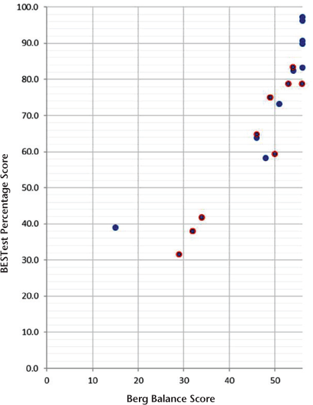 Plot of Berg Balance Scale and Balance Evaluation Systems Test (BESTest) scores by participant