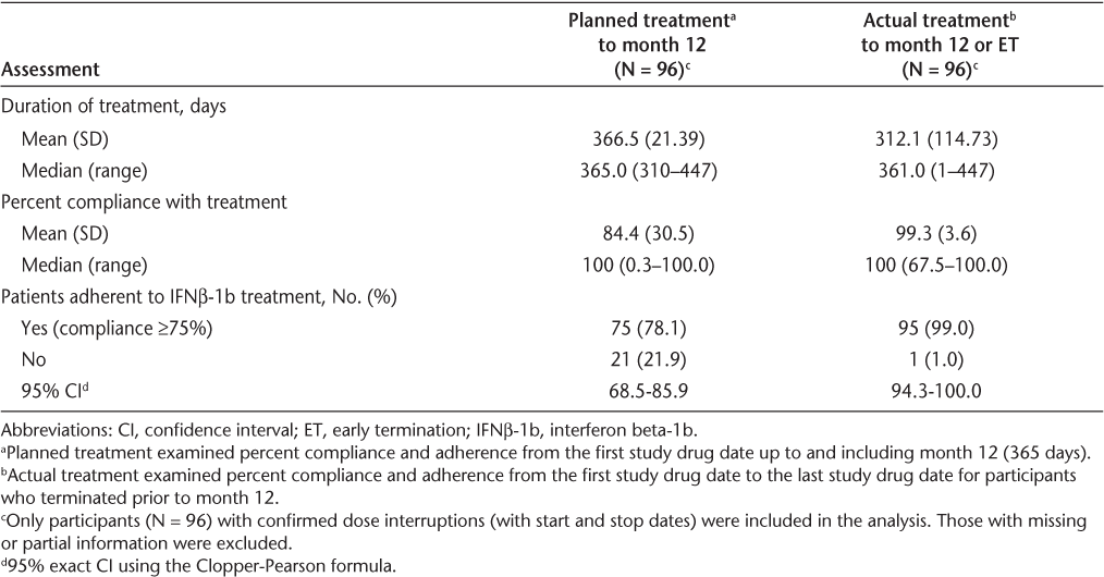 Adherence to IFNβ-1b treatment was the primary efficacy variable. Participants with a compliance rate of at least 75% were considered adherent to IFNβ-1b treatment. Based on planned treatment up to month 12, 78.1% (95% CI, 68.5–85.9) of participants were considered adherent to IFNβ-1b treatment (Table 3). Based on actual treatment up to month 12 or early termination, 99% (95% CI, 94.3–100.0) of participants were considered adherent to IFNβ-1b treatment.