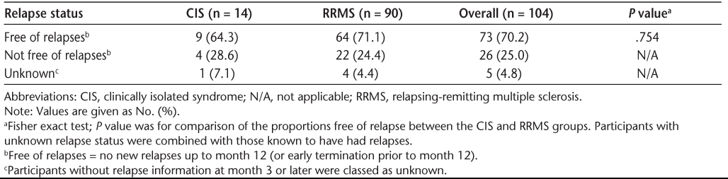 In the START trial, 65.4% of participants were free of EDSS progression to month 12. No statistically significant difference was found in freedom from EDSS progression to month 12 by baseline disease status (CIS vs. RRMS). A majority of participants (70.2%) were relapse-free at month 12. No statistically significant difference was found in relapse-free status by disease status (CIS vs. RRMS). Possible explanations for this lack of a difference are the small number of CIS patients and the very early disease stage of the RRMS group.