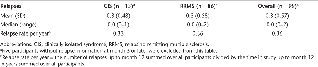 At month 12, 70.2% of participants were relapse-free; there was no statistically significant difference in relapse-free status between participants with CIS versus RRMS (P = .754) (Table 6). With IFNβ-1b treatment, the mean number of relapses at month 12 per participant was 0.3; the maximum number of relapses per participant was 1 in the CIS group and 2 in the RRMS group. At baseline, the mean yearly relapse rate was 0.6. At month 12, the mean relapse rate was 0.33 in the CIS group, 0.36 in the RRMS group, and 0.36 overall, a 40% reduction from baseline (Table 7). Approximately 70% of participants were relapse-free at month 12, regardless of the duration of IFNβ-1b treatment, when a median cutoff of 51.5 weeks was applied.