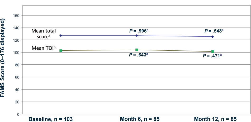 For the HRQOL outcome, the FAMS scores were high at baseline. There was very little mean change in the FAMS total score and FAMS-TOI over the course of the study (when evaluated by participants at months 6 and 12), which indicates stability of the disease course from the participants' perspective with IFNβ-1b treatment. None of the changes from baseline in FAMS total score or TOI were statistically significant.