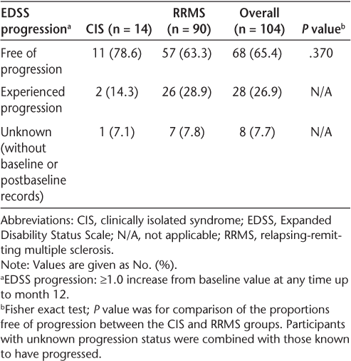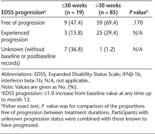 Of the 104 participants, 65.4% were free of EDSS progression to month 12 (Table 4). There was no statistically significant difference in freedom from EDSS progression by baseline disease status (78.6% of CIS participants vs. 63.3% of RRMS participants; P = .370). Similarly, there was no statistically significant difference in freedom from EDSS progression to month 12 when analyzed by median duration (51.5 weeks) of treatment (58.5% in the ≤51.5 weeks subgroup vs. 72.5% in the >51.5 weeks subgroup; P = .153). One potential explanation for this lack of difference is that the majority of participants in the RRMS group had very early disease (<1 year); differences between the RRMS and CIS subgroups might not have been observed at this early stage. Similarly, in post hoc analyses, there was no statistically significant difference in freedom from EDSS progression to month 12 when the duration of treatment analyzed was 30 weeks or less versus more than 30 weeks (47.4% in the ≤30 weeks subgroup vs. 69.4% in the >30 weeks subgroup; P = .170) (Table 5). Because most of the participants with unknown EDSS progression records were in the 30 weeks or less subgroup, interpretation of the percentage differences of participants who had progressed is difficult.