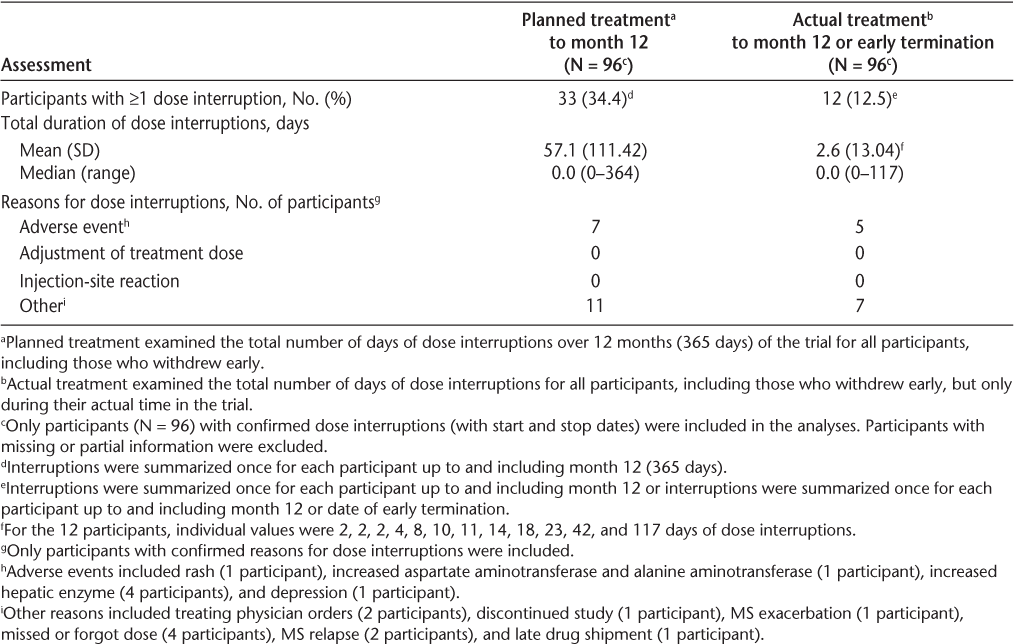 An analysis of dose interruptions based on planned treatment showed that 33 participants (34.4%) had at least one dose interruption to month 12, yielding a mean (SD) of 57.1 (111.42) days of dose interruptions (Table 2). An analysis of dose interruptions based on actual treatment showed that 12 participants had at least one dose interruption day (individually of 2, 2, 2, 4, 8, 10, 11, 14, 18, 23, 42, and 117 days) to month 12 or early termination, yielding a mean of 2.6 (13.04) days of dose interruptions. No participant missed a prescribed IFNβ-1b dose because of an injection-site reaction or needed a dose adjustment. A dose interruption due to an AE was reported in 7 patients.