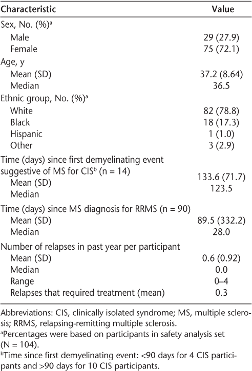 Of the 104 participants, 10 (9.6%) experienced at least one serious AE (SAE). Two participants (1.9%) were reported with MS relapse. Other SAEs, reported in 1 participant each, did not conform to a particular pattern. One of 3 participants who became pregnant during the study experienced a breech birth, recorded as an SAE. There were no deaths during the study.