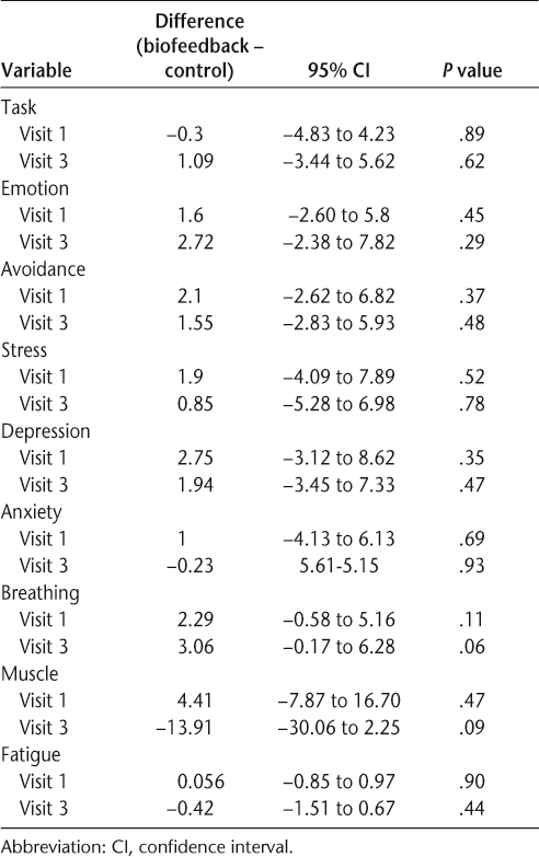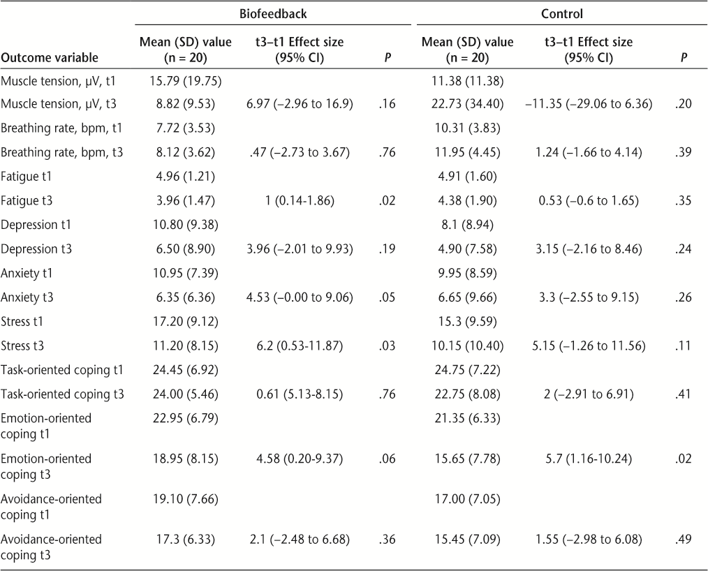 Using pre- to post-score differences only, at t3 the control group did not demonstrate significant improvements in questionnaire variables, while the biofeedback group demonstrated either significant improvement or a trend toward reduced anxiety (P = .05), fatigue (P = .02), and stress (P = .03), but not depression (P = .19).