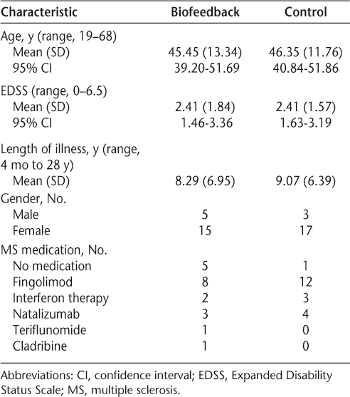 Anecdotally, patients often report stressful life events prior to relapse in MS, prompting research into the impact of stress on relapse, exacerbation, and remission.35 36 The observed reduction in breathing rate in both patient groups indicates that physiological stress reduction was achieved during the relaxation component at each visit. Biofeedback research indicates that reducing breathing rate by 3 or more breaths below base rate, as achieved in the present study, correlates with sympathetic reduction,26 which is associated with reduced anxiety and stress.27 At the third visit, both biofeedback and control groups improved in category from “mild” to “normal” stress on the DASS instrument,24 although the biofeedback group exhibited a larger effect size. The improvement in perceived stress in both groups may have been partly due to daily practice of PMR with mindful breathing. Thirty-seven of the 40 participants reported at least daily practice of PMR with mindful breathing between visits. The trend toward an improvement in stress in both groups warrants a larger study, as interventions that reduce stress may also reduce the rate of MS exacerbations3 34 and interact with coping mechanisms employed by the individual.17 35