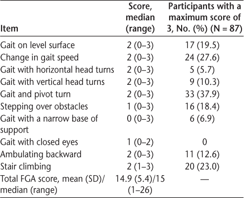 Results: The median FGA score was 15 (range, 1–26). Concurrent validity with tests of dynamic balance was moderate to strong, with the Timed Up and Go test having the highest correlation coefficient (rho = −0.74). Discriminant validity was shown with a low correlation coefficient with the MSIS psychological subscale (rho = 0.14). The FGA scores differed significantly for users of walking devices versus nonusers but not for reported falls. Sensitivity to change was moderate to low.