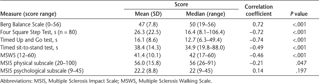 Concurrent validity was strong for the BBS, the Four Square Step Test, and the TUG test; moderate for the timed sit-to-stand test and the MSWS; and weak for the MSIS physical subscale (Table 3). The correlation coefficient was weak (rho = 0.14) and nonsignificant for the MSIS psychological subscale, hence establishing discriminant validity.