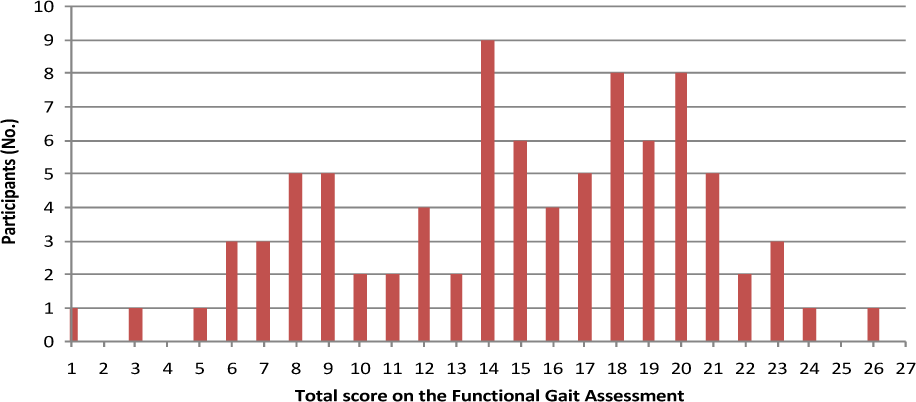 Median scores on the items in the FGA are presented in Table 2. The most difficult items to perform were walking with a narrow base of support and walking with eyes closed. A total of 71 participants (82%) had severe impairment in walking with a narrow base of support (score 0). None of the participants could walk with their eyes closed without deviating from the walkway or walking very slowly. Floor and ceiling effects on the FGA were not apparent, with scores ranging from 1 to 26. The distribution of scores is presented in Figure 1.