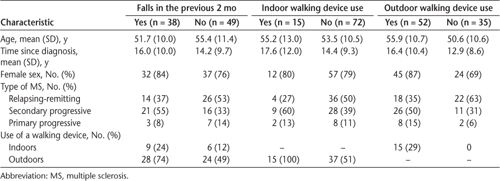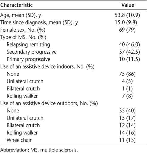 Characteristics of the 87 participants are presented in Table 1. The mean participant age was 54 years (range, 28–75 years). The participants had lived with their MS diagnosis for 1 to 46 years. Fifteen participants (17%) reported having other diseases/problems, although their main balance and walking disabilities were due to MS: musculoskeletal problems such as backache (n = 9), heart problems (n = 2), chronic obstructive lung disease (n = 1), stroke (n = 1), and Ehlers-Danlos syndrome (n = 2).