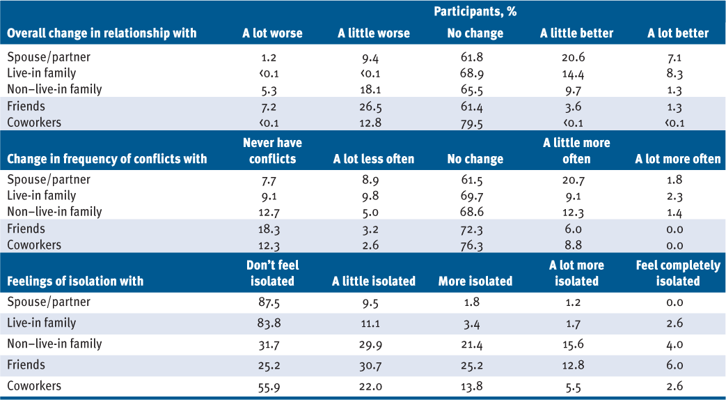 Seventy-six percent of participants reported living with a spouse/partner and 63.1% with family members. Other relationships reported: 98.3% had friends; 98% had non–live-in family; and 59.1% had coworkers. See TABLE 1 for changes in family and social relationships from March 2020 to the time of survey completion for those who reported having these relationships.