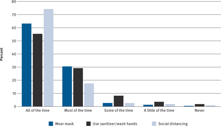 Of all the participants, 8 (3.4%), all 60 years and younger, reported contracting SARS-CoV-2 per a positive test or diagnosis by a health care provider. FIGURE 1 reports adherence to public health guidelines. Participants limited their social activities, reporting “never” or “less than 1/week” for attending in-person events (84.2%); eating out (81.5%); and socializing with those not in their bubble individually (70.2%) or in a group (85.4%). Sixty-four percent of participants ran errands “once a week” or “daily.”