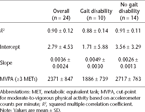 The R 2, intercept, slope, and cut-point for MVPA are shown in Table 2 for the overall sample and subsamples with and without gait disability. No statistically signifi-cant difference was found between groups in the average R2 (P > .05) or intercept (P > .05). Statistically significant differences were found in the slope of the association between accelerometer output and energy expenditure (t 22 = −2.47, P < .05) and the cut-point for MVPA (t 22 = 2.66, P < .05). The slope was significantly steeper in the sample with gait impairment, and this resulted in a significantly lower cut-point for MVPA in the sample with gait disability than in the sample without gait disability.