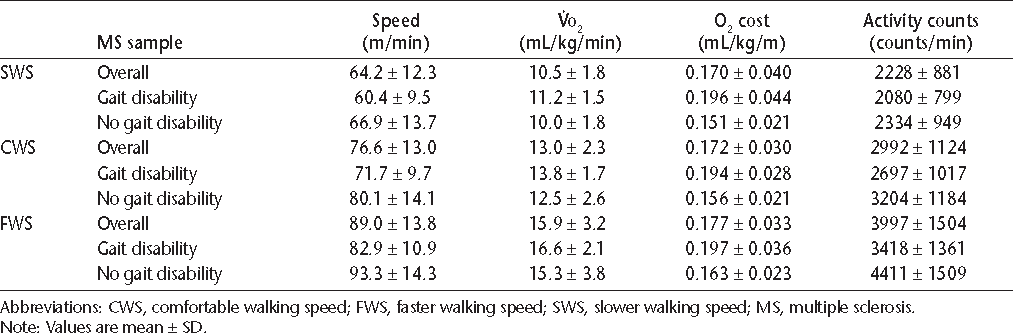 Descriptive statistics for walking speed, oxygen consumption ( O2), oxygen cost, and accelerometer activity counts for the different MS samples