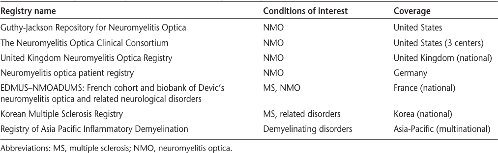 Although the number of studies included was small, this review highlights some important issues related to NMO. Population-based epidemiological data are limited but are critical for health-system management, to identify temporal trends in disease risk, and for generating testable etiologic hypotheses. Such studies will face challenges. The diagnostic criteria for NMO continue to change, and variant NMO spectrum disorders are increasingly being identified.22 In the absence of specific criteria for these variant disorders, they are unlikely to be captured in incidence and prevalence studies and the total burden of NMO spectrum disorders may be underestimated. Further, when new criteria are developed, the inclusion of these new cases will make it difficult to distinguish true temporal trends in disease incidence from changes in ascertainment. Future studies should clearly report the criteria used and distinguish between NMO variants to enhance comparability of estimates when criteria change. Future studies should report results standardized to the world population and provide subgroup-specific estimates. In jurisdictions where health care is universal and publicly funded, administrative (health claims) data may offer the opportunity to conduct such population-based studies on an ongoing basis at relatively low cost as has been done in other chronic diseases, including MS.35 In jurisdictions where such data do not exist, rare-disease registries may be an option (see Table 3 for examples),6 although complete ascertainment will be a challenge.