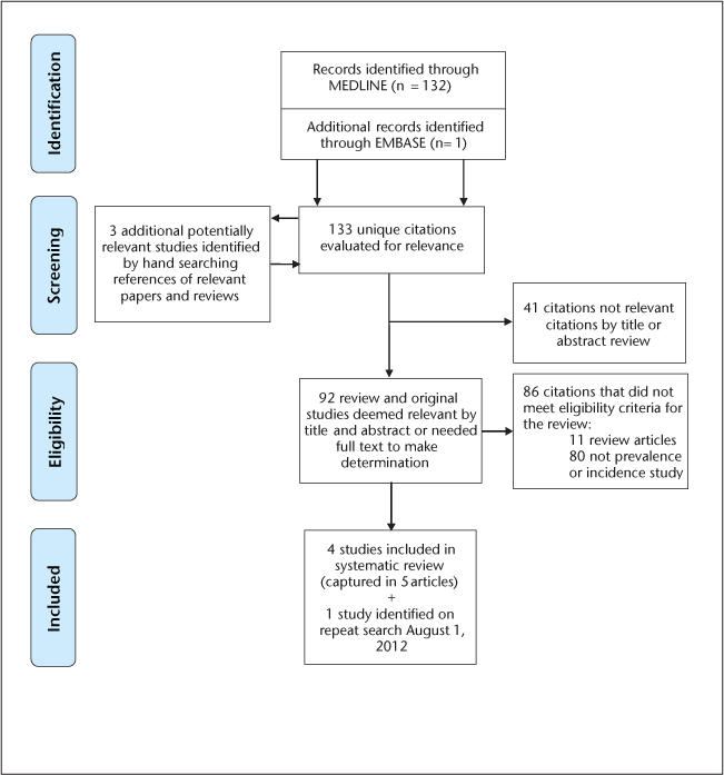 The initial search resulted in 133 unique citations, and 3 additional potentially relevant studies were identified by hand searches of the reference lists of relevant papers and reviews (Figure 1). Four studies met the inclusion criteria, of which three were from North America.12–16 Data from one of the studies were reported in two articles, which were treated as a single study.13 15 Some of the cases reported in those two articles had already been reported in an earlier study, which was not reviewed separately either.17 One additional study was identified by repeating the search on August 1, 2012,18 for a final total of five studies. Studies were published between 2005 and 2012 (Table 1).