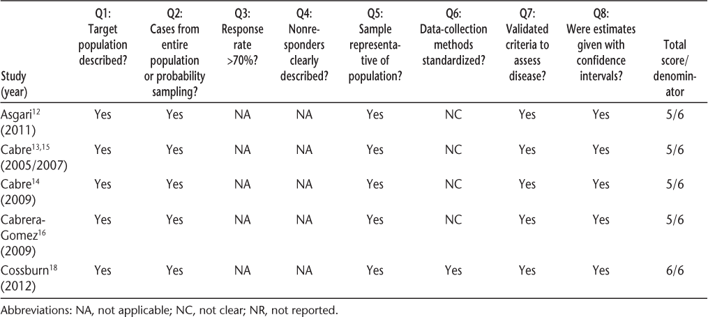Quality of the studies was similar (Table 2). Only the most recent study was explicit as to whether the assessments of potential cases were standardized, although it is likely that some of the assessments were standardized in other studies. Only one study reported incidence or prevalence estimates that were standardized to a reference population.14 Further, only one study formally reported age-, sex-, or ethnicity-specific prevalence estimates.16
