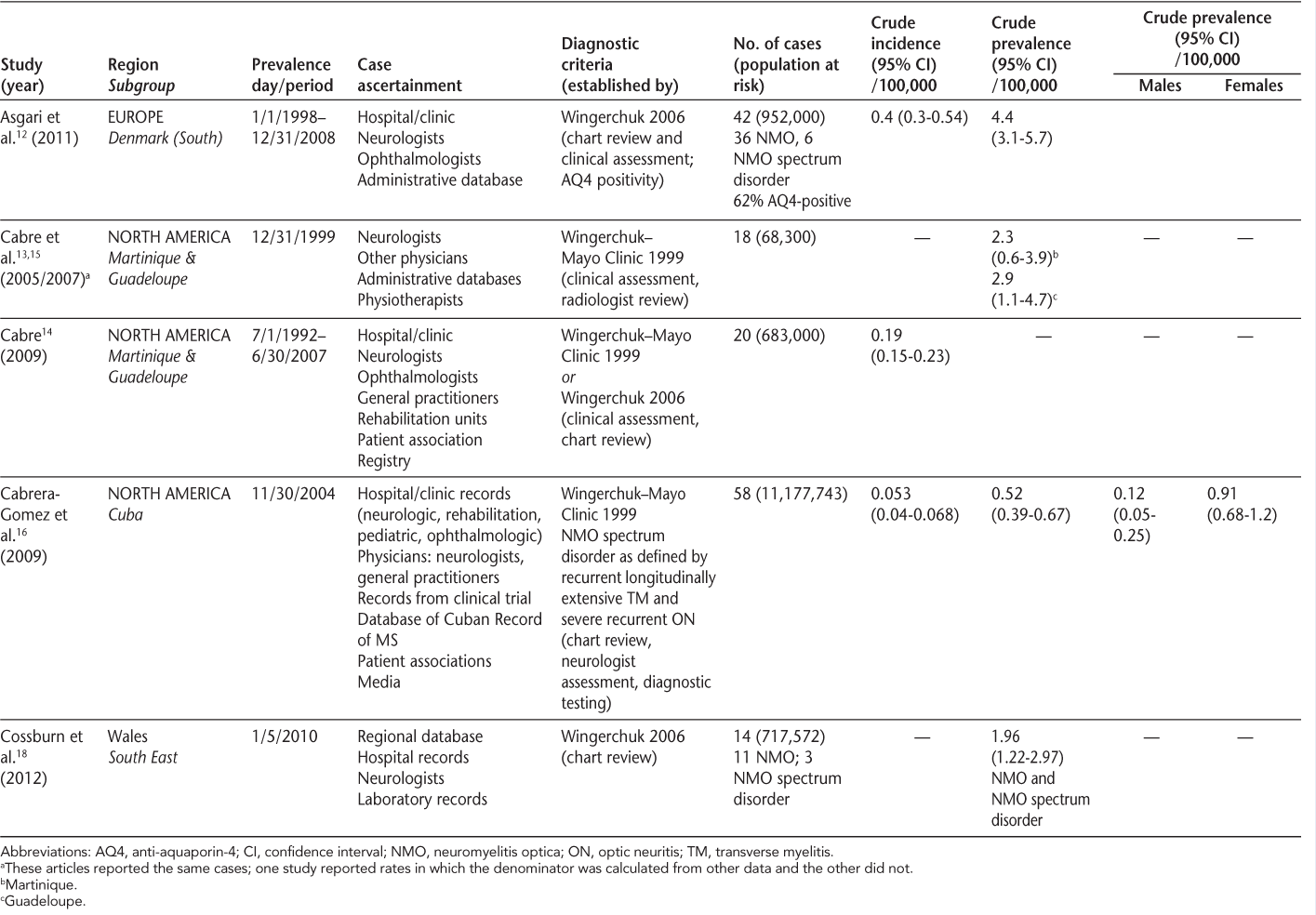 Systematic review of incidence and prevalence of neuromyelitis optica, January 1, 1985–March 19, 2012
