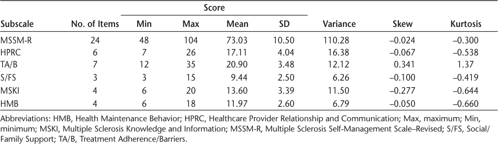 The MSSM-R had acceptable face and content validity. Confirmatory factor analysis results showed that 24 items on this scale have factor loadings in five subscales. Other results showed the internal consistency, as measured by Cronbach α and test-retest reliability, for the MSSM-R overall (α = 0.85, r = 0.77) and for the following subscales: Healthcare Provider Relationship and Communication (α = 0.83, r = 0.70), Treatment Adherence/Barriers (α = 0.70, r = 0.71), Social/Family Support (α = 0.79, r = 0.85), MS Knowledge and Information (α = 0.89, r = 0.72), and Health Maintenance Behavior (α = 0.77, r = 0.75).