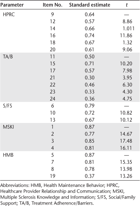 The verification of structural validity by confirmatory factor analysis showed that the 24 items in five subscales were confirmed and all items with factor load were acceptable, and the result is in line with that of the study by the designers of this scale.7 In the present study, the internal consistency for subscales was calculated to be between 0.70 and 0.89, and it was 0.85 for the overall score of the MSSM-R. The designers reported α coefficients for subscales between 0.59 and 0.88, and 0.85 for the overall score of the MSSM-R.7 The overall score of the study is identical to that of the study by the original designers, but the study of subscales shows that the Persian version has better internal consistency and all the subscale scores were calculated to be higher than 0.70. Furthermore, in Mashhad, the internal consistency of this scale was calculated in 291 patients with MS (α = 80), but other psychometric information was not reported in that study.23 In another study, the reliability coefficient was tested by a 2-week test method of 0.83, indicating high reliability of this scale.18