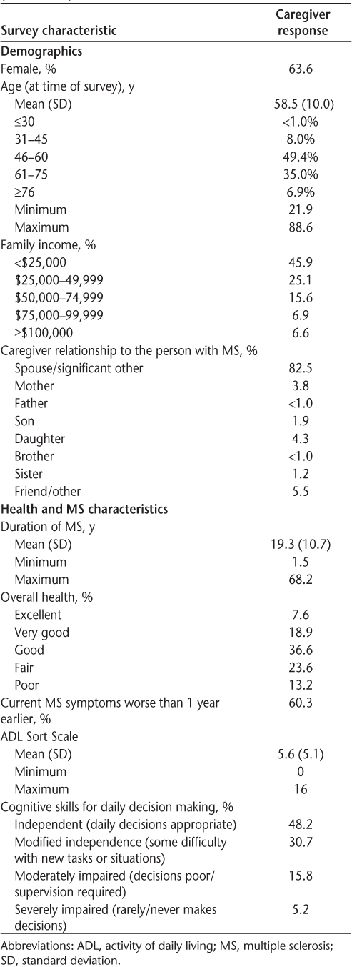 The sample of caregivers for this study was recruited using the North American Research Committee on Multiple Sclerosis (NARCOMS) Registry. The NARCOMS Registry contains the names and contact information for 35,000 people with MS at least 18 years of age who volunteered to participate in routine data collection and other research projects.16 Registry participants are assured confidentiality and that their names will not be disclosed to anyone without the participant's written permission.