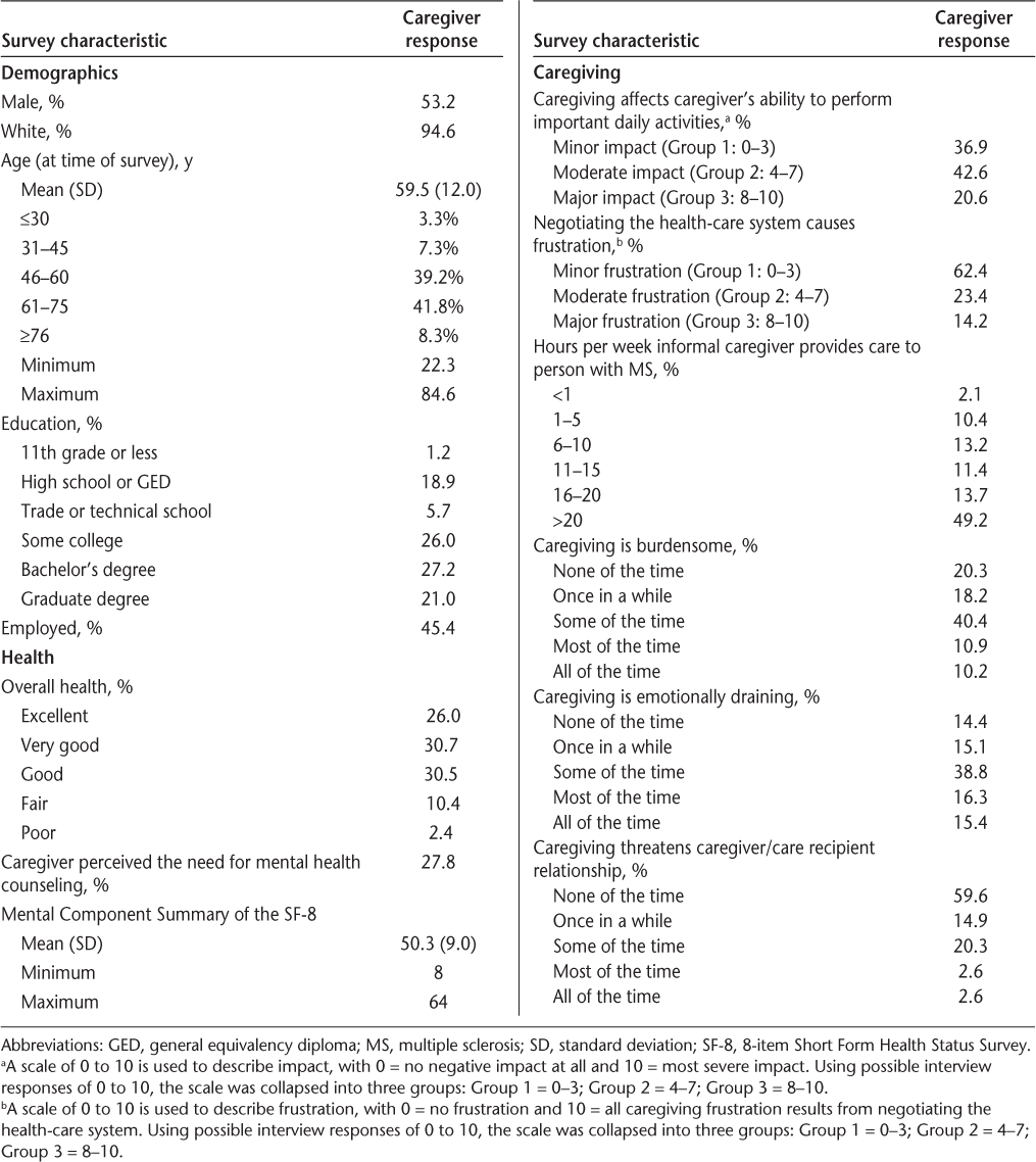 The interviewer asked caregivers to provide the average number of hours per week they spent “providing care and assistance to help [the person with MS] cope with the effects of MS.” The caregivers were asked to provide any number from 0 to 10 to describe how assisting the person with MS “affects your ability to perform activities in daily life that are important to you,” with 0 indicating no negative impact at all and 10 indicating the most severe impact. Caregivers were asked to describe how much of any caregiving burden or frustration that they may have experienced was caused by negotiating the health-care system using a scale of 0 to 10, with 0 indicating no frustration or burden and 10 indicating that all of their caregiving frustration or burden resulted from negotiating the health-care system. The interviewer read a list of statements assessing the feelings that caregivers may have experienced when assisting the person with MS, including “caregiving is burdensome,” “caregiving is emotionally draining,” and “caregiving has strained or threatened the caregiver/care recipient relationship.” These caregiver feelings were measured using a 5-point Likert item, with possible responses of none of the time, once in a while, some of the time, most of the time, and all of the time.