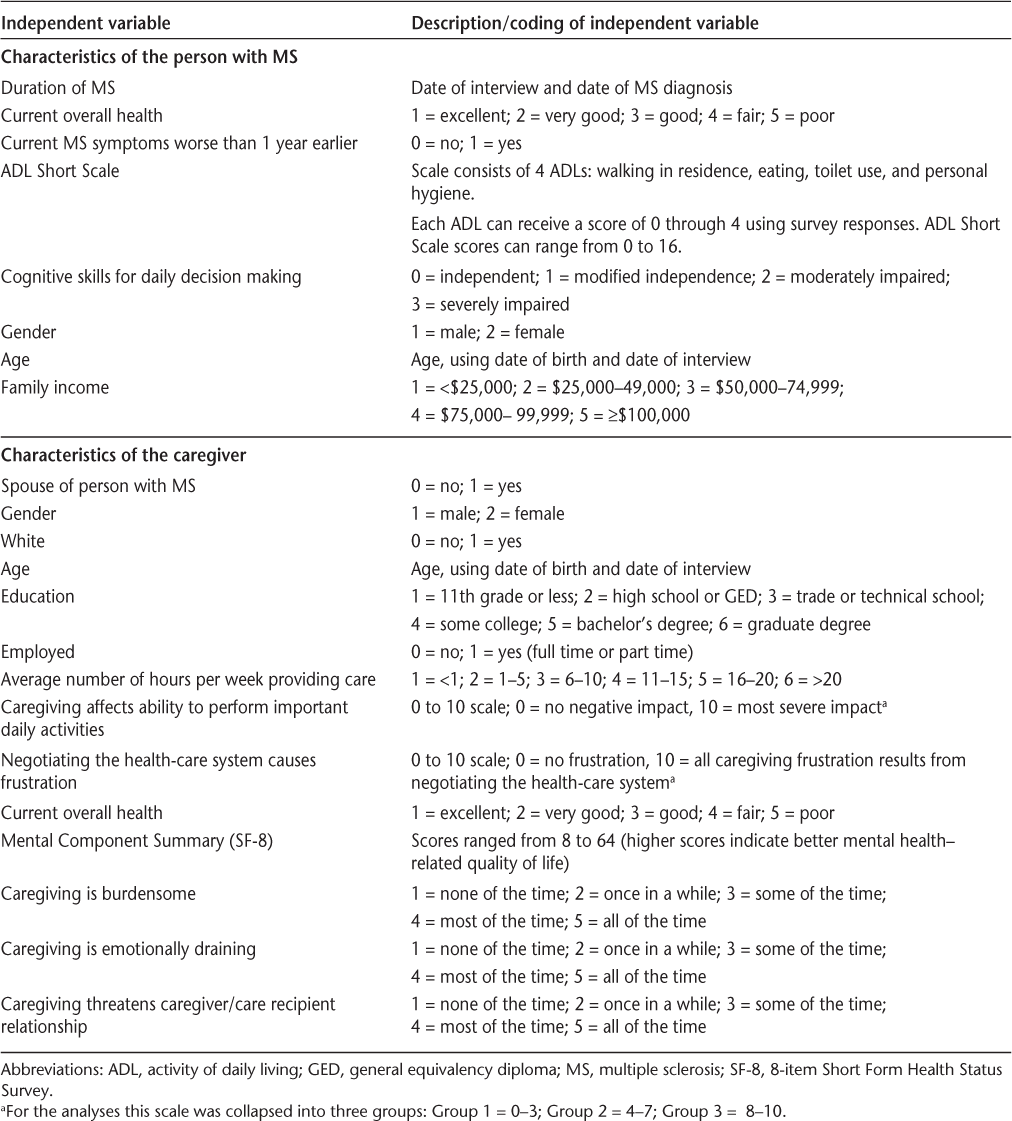 The independent variables in this study consisted of characteristics of the person with MS and characteristics of the caregiver, including the caregiver's perceptions of caregiving. Table 3 presents these independent variables and describes how they were coded. Our analyses included 423 informal caregivers in the regression model (caregivers providing all data in their survey responses needed to implement our model).