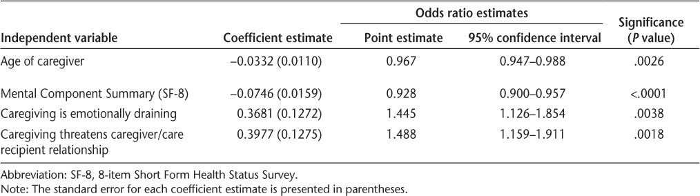 Interviewers asked the caregivers: “In the past 12 months did you think you needed or would benefit from treatment or counseling from a mental health professional such as a psychologist, psychiatrist, or mental health counselor or therapist?” This perceived caregiver need for mental health care is the dependent variable in our analyses. Because the study utilized a dichotomous dependent variable (coded as 0 = no; 1 = yes), we developed a logistic regression model. We utilized the stepwise selection procedure to reduce the number of independent variables in the initial regression model. This procedure eliminates the least significant independent variables from the initial regression model, which included a range of independent variables that we theorized might be associated with the caregiver's perceived need for mental health care. The stepwise selection method has the advantage of producing a small, readily interpretable model containing the most important predictor variables23 and is widely used in medically related applications.24 The initial regression model included 22 independent variables developed using survey response data. The stepwise selection procedure excluded 18 independent variables from this initial regression model, with the final model identifying 4 characteristics of caregivers and caregiving that were significantly associated with the caregiver's perceived need for mental health care at the level of α = .05 (Table 4).