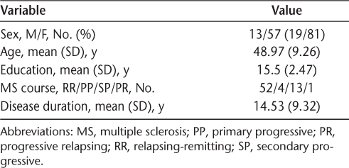 Participants consisted of individuals diagnosed as having clinically definite MS who were enrolled in a randomized clinical trial examining the effectiveness of a memory retraining program in MS. For all the participants, it must have been at least 1 month since their most recent exacerbation and corticosteroid use. Individuals with a history of stroke or neurologic injury/disease, psychiatric illness, or alcohol or drug abuse were excluded. All the study procedures were approved by the institutional review board of the Kessler Foundation. Informed consent was obtained from all the participants at the screening evaluation. Seventy individuals diagnosed as having clinically definite MS were enrolled in the present study and completed a neuropsychological test battery, which is reported herein. The mean (SD) age of the participants was 48.97 (9.26) years, and the mean (SD) amount of education was 15.5 (2.47) years (Table 1).