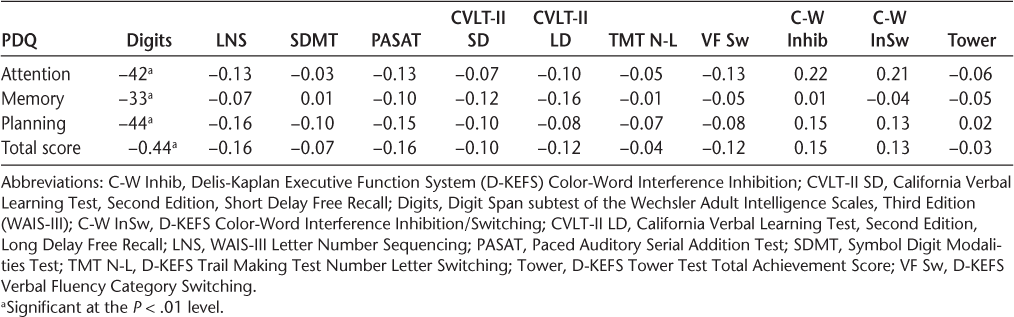 Pearson correlations indicated that individuals' self-reports on the PDQ were related only to performance on a simple measure of attention (Digit Span). More specifically, a significant correlation was noted between Digit Span and all indices of the PDQ (r = −0.33 to −0.44). There were no other significant correlations with the PDQ and any of the other objective neuropsychological measures (Table 3).