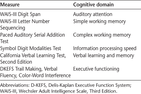 Multiple sclerosis (MS) is a neurologic disorder that affects approximately 2.3 million people worldwide.1 Cognitive and behavioral changes are common following the onset of this most common nontraumatic neurologic disorder of middle adulthood. In particular, cognitive dysfunction affects approximately 43% to 70% of individuals with MS.2 The degree of cognitive impairment varies among individuals, but the most affected domains include information processing speed2 and learning and memory.1–4 To a lesser extent, impairments in executive functioning, attention, and visuospatial abilities have also been reported.5 Due to the high prevalence of cognitive impairment in individuals with MS, and its potential to detrimentally affect individuals' vocational and personal life, identification of cognitive deficits is of paramount concern.