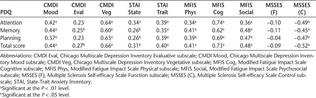 In contrast, cognitive concerns on the PDQ were significantly correlated with all self-report indices. In particular, the total PDQ score was correlated with depression (Mood subscale: r = 0.44, P < .001; Evaluative subscale: r = 0.27, P = .025; Vegetative subscale: r = 0.66, P < .001), anxiety (state: r = 0.31, P = .010; trait: r = 0.40, P = .001), fatigue (physical: r = 0.41, P < .001; cognitive: r = 0.73, P < .001; psychosocial: r = 0.48, P < .001), and self-efficacy (control: r = −0.52, P < .001). In addition, each index of the PDQ (ie, Attention, Memory, and Planning) maintained significant associations with each self-report factor. See Table 4 for the correlations with the specific breakdown of all the subscales of the PDQ.
