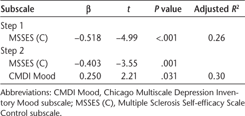 These findings highlight the importance of individual factors, specifically, self-efficacy and, to a lesser extent, depression, in the perception of cognitive dysfunction in MS and suggest that interventions aimed at enhancing one's self-efficacy and managing depression may be warranted in reducing the impact of perceived cognitive difficulties in individuals with MS. Interventions targeted at improving self-efficacy have also been found to have significant benefits for treated individuals. Improved self-efficacy after a wellness intervention has been shown to result in greater engagement in health-promoting behaviors, which are important for managing one's MS. Improved health-related quality of life (ie, pain and mental health) was noted specifically in women with MS. There were also benefits seen in functional outcomes (ie, employment). In particular, although there were no differences in the rate of employment at baseline, more women in the intervention group were found to be employed at 8-month follow-up.36 These findings suggest that interventions aimed at enhancing self-efficacy are effective at improving overall health as well as functional outcomes in MS. Thus, greater attention should be given to the assessment and treatment of self-efficacy in individuals with MS, particularly given the variability and uncertainty associated with MS. Findings from the present study similarly highlight the importance of self-efficacy in the accurate perception of one's cognitive abilities. Recently, greater attention has been given to the role of self-efficacy in the perception of cognitive functioning in MS. Previous findings suggest that interventions aimed at improving self-efficacy result in more accurate perceptions of cognition in MS, which could inform outcomes and influence one's overall quality of life. Further studies examining the effectiveness, feasibility, and long-term outcomes of such interventions seem warranted at this time.
