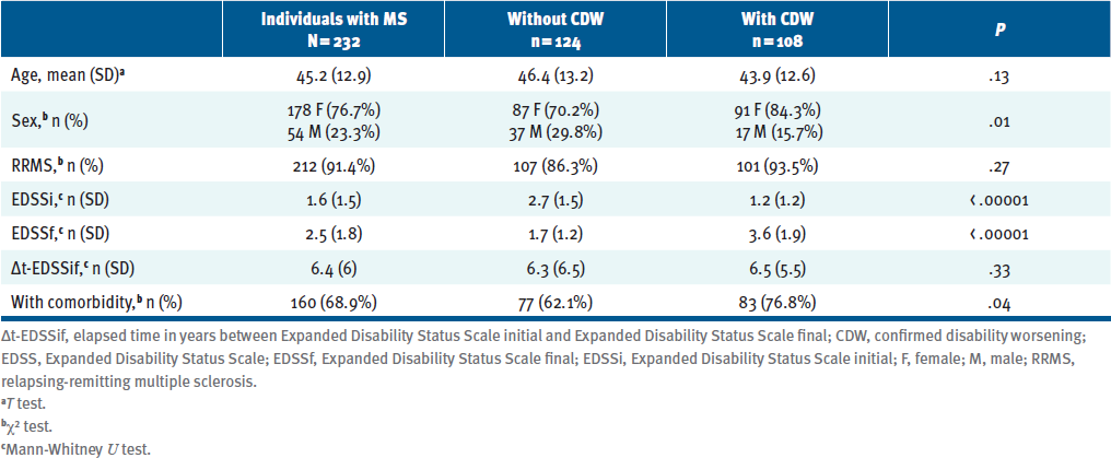 In a comparison of patients with vs without CDW, a significant difference in sex was observed, with a lower number of male patients among individuals with CDW (P = .01) and in the number of patients with comorbidities (P = .04). There was no significant difference in age, MS phenotype, or in the Δt-EDSSif. There was a highly significant difference in EDSSi (P < .0001), with patients without CDW presenting a higher average score. EDSSf was also significantly higher in patients with CDW (P < .0001). Among the 108 (46.5%) individuals with CDW, 83 (76.8%) had comorbidities. In turn, among patients without comorbidities, 77 (62.1%) did not have CDW (TABLE S3).