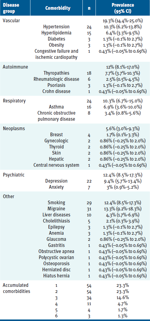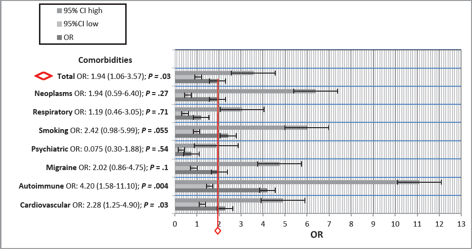 Comorbidities were present in 68.9% of individuals. The most prevalent comorbidities included cardiovascular diseases (19.3%), migraine (13.3%), psychiatric disorders (12.4%), smoking (12.4%), autoimmune diseases (12.0%), respiratory diseases (10.3%), and neoplasms (5.6%). Patients with 1 comorbidity and those with multiple comorbidities (≥ 3) had a significant PR for CDW (2.67, P = .01; 1.25, P = .03, respectively). Cardiovascular and autoimmune diseases presented significant PR for CDW (2.28, P = .03; 4.2, P = .004, respectively).