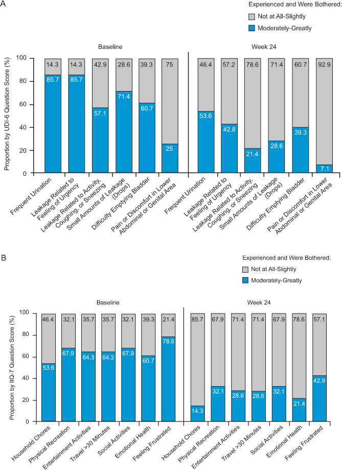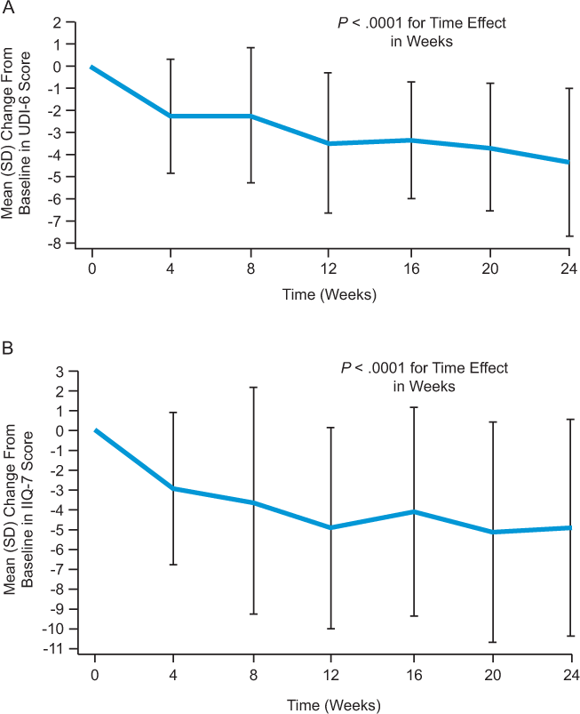 Mean improvement from baseline to week 24 in (A) total UDI-6 score and (B) total IIQ-7 score